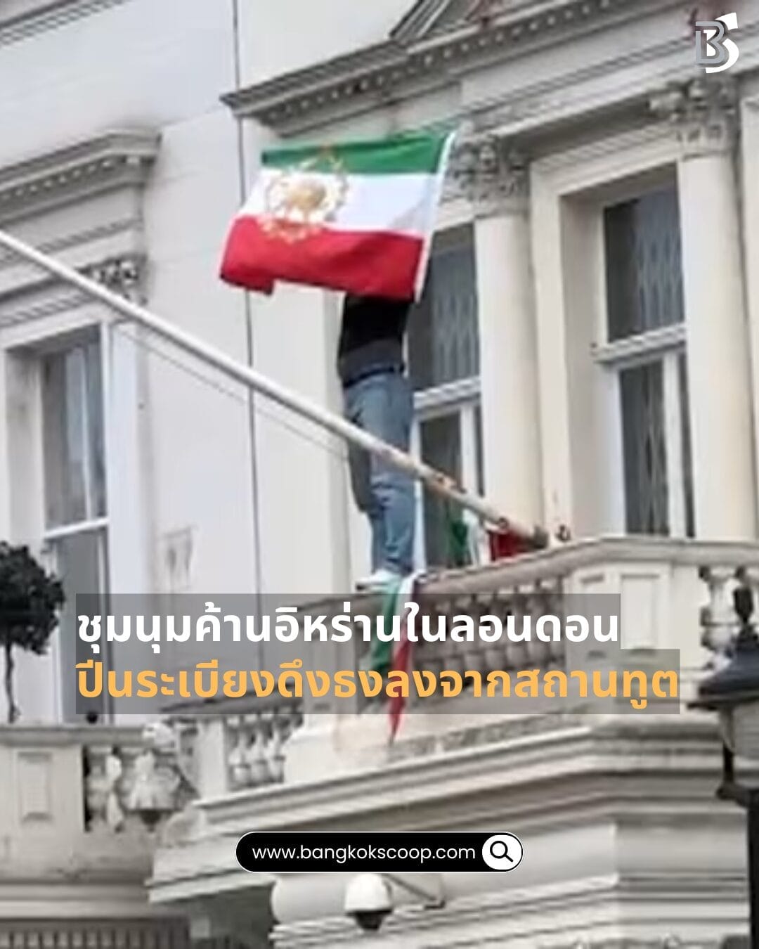 เกิดเหตุผู้ประท้วงต่อต้านรัฐบาลอิหร่านปีนขึ้นไปบนระเบียงอาคารสถานเอกอัครราชทูตอิหร่านในกรุงลอนดอน ขณะที่กลุ่มผู้ชุมนุมหลายร้อยคนรวมตัวด้านหน้าโบกธงและตะโกนต่อต้านรัฐบาล ขณะที่ตำรวจลอนดอนจับกุมผู้ประท้วงแล้ว 2 รายและยังติดตามตัวผู้เกี่ยวข้องเพิ่มเติม การชุมนุมครั้งนี้เกิดขึ้นท่ามกลางสถานการณ์ประท้วงในอิหร่านที่รุนแรงต่อเนื่องหลายปี โดยมีผู้เสียชีวิตหลายสิบรายจากการปะทะกับเจ้าหน้าที่และการตัดสัญญาณอินเทอร์เน็ตเพื่อควบคุมสถานการณ์