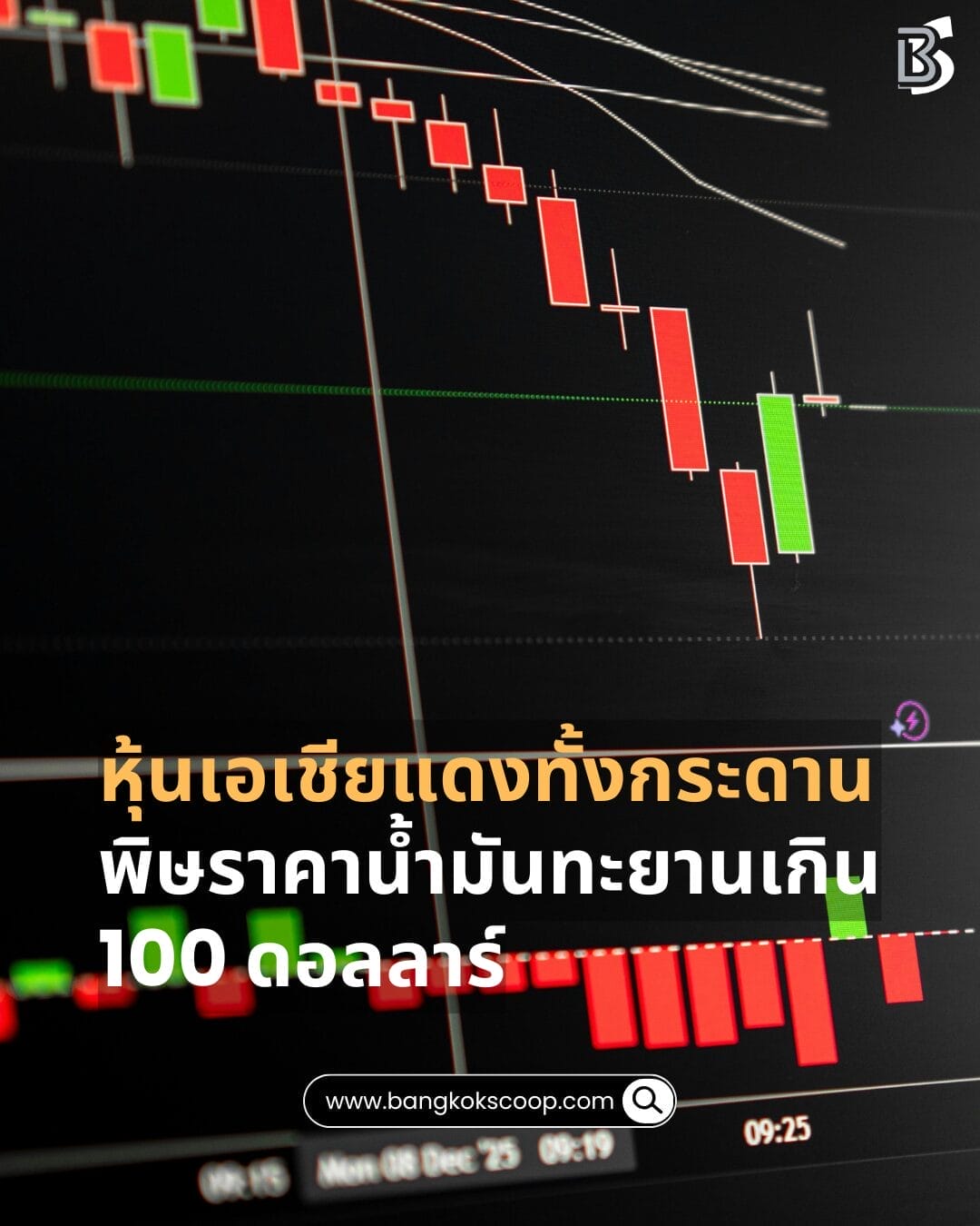 ตลาดหุ้นเอเชียปรับตัวลดลงอย่างหนักทั่วภูมิภาค หลังราคาน้ำมันดิบโลกพุ่งทะลุ 100 ดอลลาร์ต่อบาร์เรลจากความตึงเครียดในตะวันออกกลางและการปิดช่องแคบฮอร์มุซ ทำให้นักลงทุนเทขายสินทรัพย์เสี่ยงและหันไปถือสินทรัพย์ปลอดภัย ดัชนีหลายตลาดร่วงแรง เช่น KOSPI ของเกาหลีใต้ลดลงกว่า 6% จนต้องหยุดการซื้อขายชั่วคราว ขณะที่ตลาดหุ้นไทยเปิดตลาดลดลงกว่า 70 จุด นักวิเคราะห์มองว่าความผันผวนยังสูงจากความเสี่ยงสงครามและราคาพลังงานที่อาจกดดันเศรษฐกิจโลกต่อไป