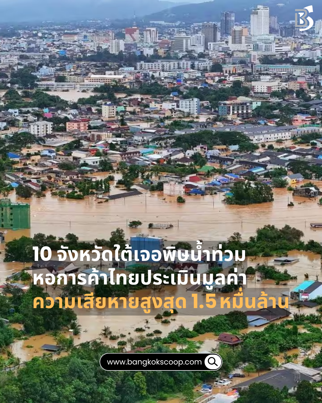 หอการค้าไทย ประเมินว่าน้ำท่วมที่เกิดใน 10 จังหวัดภาคใต้ ครอบคลุมพื้นที่เศรษฐกิจและการท่องเที่ยว อาจทำให้เกิดความเสียหายวันละประมาณ 1.5 พันล้านบาท ถ้าสถานการณ์ยืดเยื้อตลอดเดือน ศก. การสูญเสียรวมอาจพุ่งแตะ 1–1.5 หมื่นล้านบาท ผลกระทบต่อเศรษฐกิจท้องถิ่นโดยเฉพาะภาคการท่องเที่ยว การค้า และการลงทุน ถูกประเมินว่าอาจหนักขึ้น เพราะเป็นช่วง “ไฮซีซัน” ที่ควรได้รับนักท่องเที่ยวจำนวนมาก